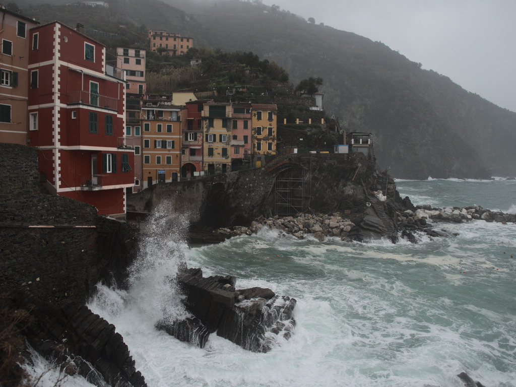 Arrivo a Riomaggiore in una fresca mattina d'inverno, mentre è in corso una rombante mareggiata, generata dall'intenso libeccio di ieri. Il cielo non si è ancora sgombrato e il sole è rimasto oscurato da spesse velature; al largo aleggia inoltre una densa foschia, che rende Punta Mesco indefinita e cupa come uno spettro gotico. Attraversato il tunnel pedonale e sceso alla marina, dove c'è una no-fly zone per i droni. Mi inerpico su un paio di punti panoramici (uno dei quali è successivamente raggiunto da un'ondata più alta della media), da cui fotografare le case e gli spruzzi, artefici di una nebbiolina salmastra che tutto avvolge. In cielo c'è la luna quasi piena, in procinto di tramontare sul mare. Cambio obiettivo con molta accortezza. Purtroppo un poggio strategico, da cui una volta ripresi il paese al tramonto, è transennato per lavori ed è stata rimossa una fotogenica agave, dopo essere fiorita e morta. Assieme a me gironzolano pochi altri turisti, anche loro tutti intenti a fotografare; la maggior parte della gente scesa dal treno delle 8 sembrava invece formata da lavoratori. Gironzolo a tempo perso tra i vicoli, tra cui ieri, durante la furia del libeccio, scorrevano rivoli d'acqua per gli spruzzi e la condensa. Prima di partire per l'escursione, vado infine a prendere un caffè nell'unico bar aperto in bassa stagione, dove ieri l'avevo pagato 1,5 €, mentre oggi me lo fanno solo a 1 €. Forse faccio più colpo sul barista di oggi che sulla barista di ieri…