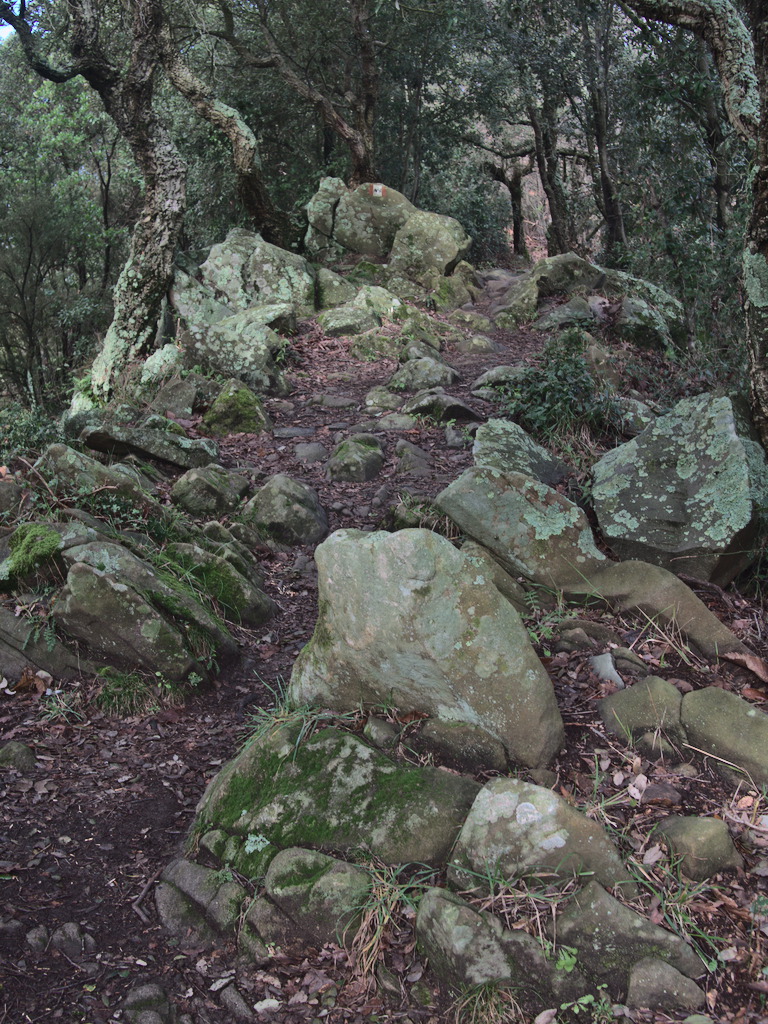 Visto che ora il tragitto si prospetta in piano, riparto con un pile addosso. La strada, che davanti a sant'Antonio era lastricata in porfido, prosegue ampia e sterrata sul crinale. Su un masso di colore giallastro due targhe ricordano chi si è preso cura di questi sentieri. Credo che il masso appartenga al complesso del macigno, una roccia sedimentaria originata dai depositi delle correnti di torbida, quindi in ambiente sottomarino. Lascio il crinale, che sale fino a un cocuzzolo, e resto invece sul versante del golfo, tra castagni e qualche pino. Aggirato il dosso, lascio la strada e proseguo su un ampio sentiero sulla dorsale, con lecci sul lato marino e castagni e pini dall'altro. Passo da una zona con alberi segati e mi porto sul versante marino, dove sento il mare ruggire in basso. I tronchi sono coperti di licheni prevalentemente sul lato a mare. Chi è venuto qui in un giorno di libeccio sa bene il perché: il vento, raccolta l'umidità del mare, risalendo il pendio condensa in una nebbiolina fradicia, sferzata contro i tronchi, che inzuppa su quel lato. È successo giusto ieri e la fanghiglia sul sentiero è ancora qui a ricordarlo.
