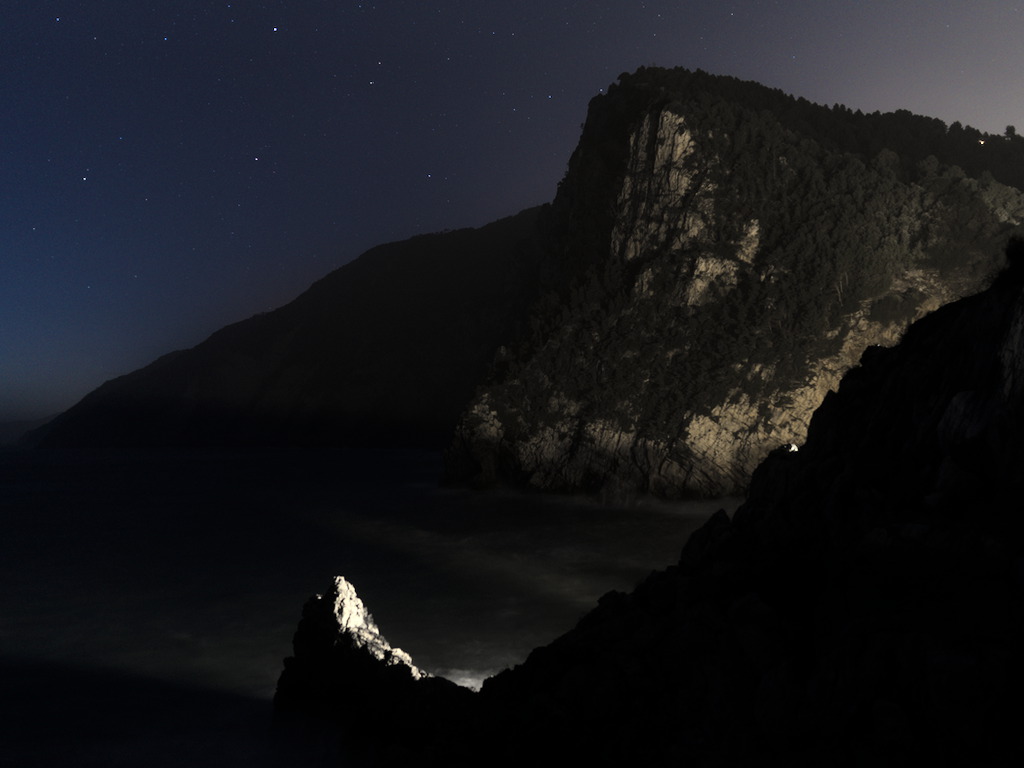 Quando le tenebre sono in procinto di calare, torno alla chiesa e la fotografo nel crepuscolo al sodio, per poi dedicarmi al Muzzerone una volta calato il buio. La grotta di Byron è illuminata a giorno e la sua luce arriva fino alle falesie, ma l'effetto non mi disturba e non mi imepdisce di immortalare le stelle. Riattraverso infine il paese per l'ultima volta e vado al capolinea del bus per La Spezia, che mi riporta in città per la tortuosa strada litoranea.