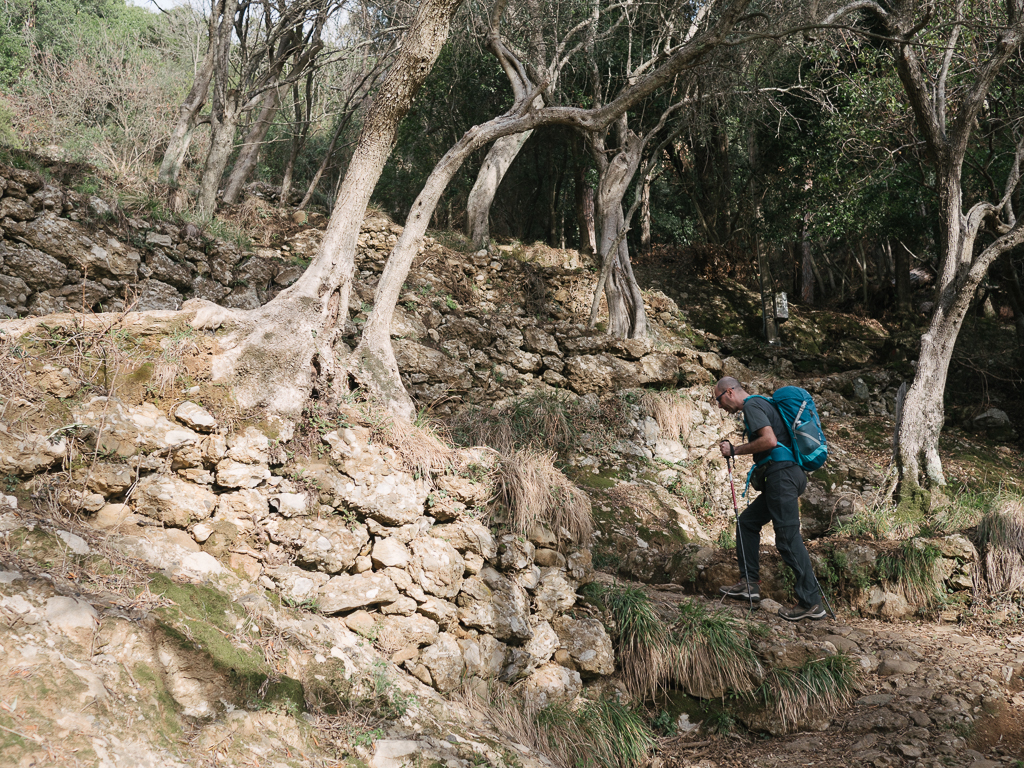 Incrocio una signora vestita pesantemente (io sono in maglietta, come del resto lo ero stato per tutta la sosta sulla spiaggia). Presso il rifugio, che si trova al limite superiore dei terrazzamenti, un uomo sta sfrondando degli olivi. A monte, dove comincia la macchia, ci sono delle strisce di terra arate dai cinghiali. Nella mia guida degli anni Ottanta nemmeno erano citati tra la fauna del parco, mentre oggi, dopo le introduzioni di ibridi prolifici da parte dei cacciatori e l'abbandono di castagneti e querceti, che offrono loro grandi quantità di cibo, sono onnipresenti. Attraverso poi la zona della sorgente Caselle, captata da un vecchio acquedotto, dove c'è anche una fontanella, che nella stagione calda deve essere davvero provvidenziale. Lungo i letti dei ruscelli un occhio più attento del mio potrebbe vedere dei pisoliti, minuscoli granelli bianchi, formati da oggetti vari rivestiti da carbonato di calcio depositato dall'acqua sorgiva. Qui si stacca un sentiero, conosciuto come Via dei Tubi, che segue l'acquedotto; moderatamente avventuroso, da una decina d'anni può essere percorso solo in compagnia di una guida del parco. Un po' per volta la macchia è sostituita da un bosco a prevalenza di lecci. Più in alto fa la comparsa qualche castagno ceduo. Questo incavo umido che alimenta la sorgente è una barriera al propagarsi degli incendi, che nella stagione secca qui sono frequenti.