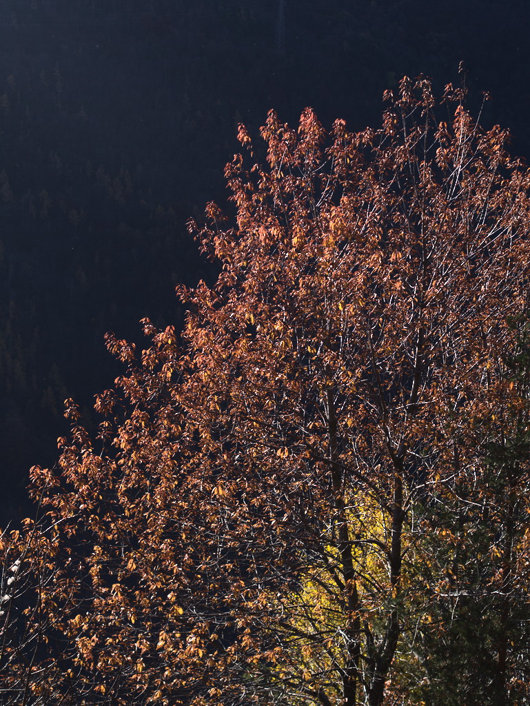 Al tornante proseguo dritto per uno spettacolare sentiero tra bosco e rocce, nel primo tratto con qualche scorcio sulla zona appena attraversata. I colori autunnali sono proprio nel pieno e questo paesaggio di boschi, radure e case sparpagliate offre il suo lato migliore. Proseguo lungamente tra pareti e pini, un ambiente affascinante che ho serie difficoltà a fotografare, specie con la luce secca di oggi. Ad un certo punto noto un roccione dall'aspetto di un menhir; il fascino dell'insieme è tale che mi sembra anche di scorgere delle incisioni, tanto da desiderare di invocare lo spirito di Sittoni per chiedergli consiglio. Ovviamente la roccia non compare da nessuna parte nei cataloghi di reperti preistorici delle Alpi piemontesi, per cui è pura suggestione (in valle ci sono invece delle coppelle). Raggiungo infine delle zone terrazzate e quindi dei prati invasi, nei pressi della Pro Loco di Bovile.