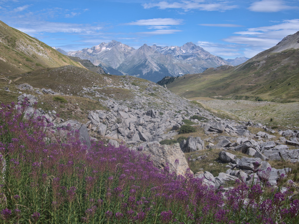 Lascio il sentiero che scende a valle e prendo a sinistra una traccia che rimane più o meno in quota, dove corre anche la GR5, il trek di lunga percorrenza delle Alpi Francesi, segnalato da tacche biancorosse simili a quelle del CAI. Lo seguirò fino alle Grange di Valle Stretta. Ondeggio tra dossi morenici, come si capisce dai massi di varie dimensioni che mi circondano. Qui sono coperti di erba, mentre più a valle, dove c'è una grande conca, sono in certe zone molto erosi dal torrente, che oggi è pressoché secco. Dopo essere rimasto a lungo tra erba e sassi, passo per una zona colonizzata da bassi cespugli di rododendro. Su e giù per dossi, arrivo alla base di una dorsale erbosa, dove c'è una romantica fioritura di epilobi. Comincio la salita della dorsale evitando la traccia più marcata, che sale diretta, seguendo invece il vecchio sentiero che fa un tornante. Dove mi congiungo alla prima, trovo una coppia di ragazzi francesi che mi chiedono delle indicazioni. Ad ogni modo, non conosco nessuno che sarebbe in grado di perdersi qui, visto che i sentieri sono molto evidenti e a ogni bivio ci sono le paline. Apparentemente la ragazza non parla nemmeno un inglese di sopravvivenza come il mio.