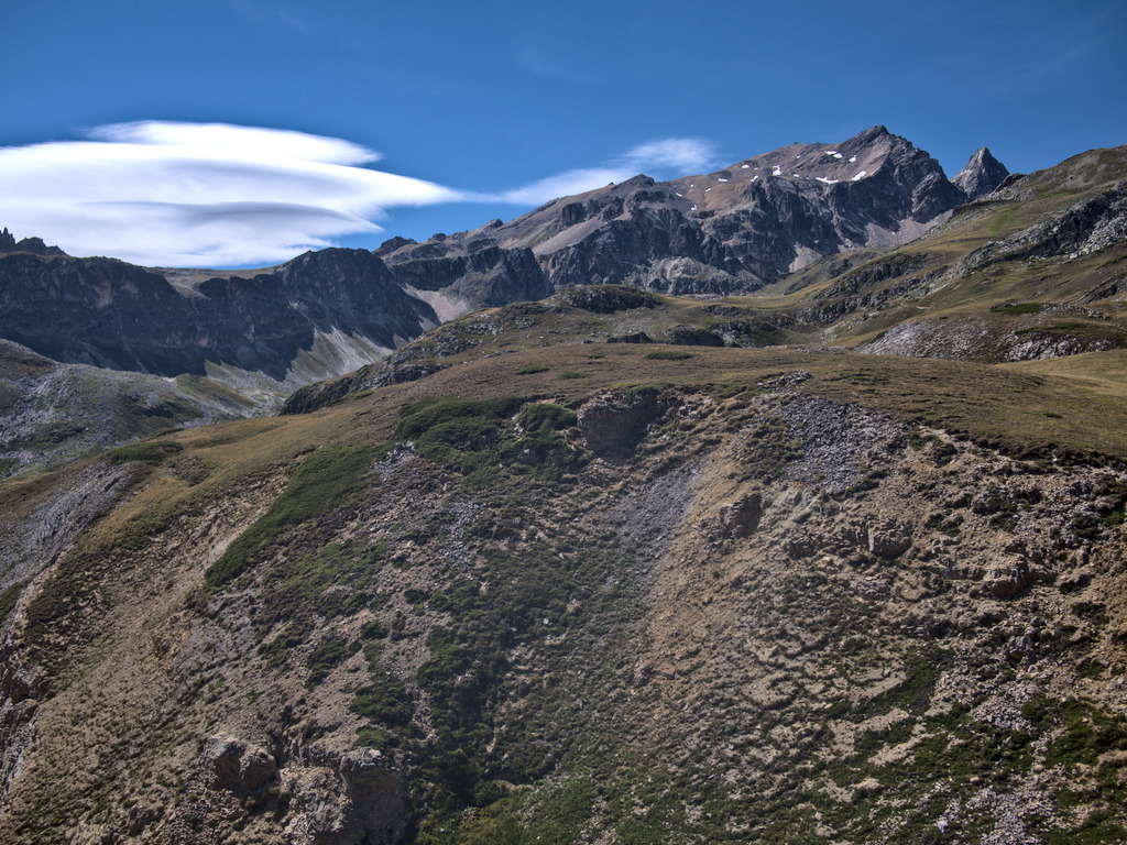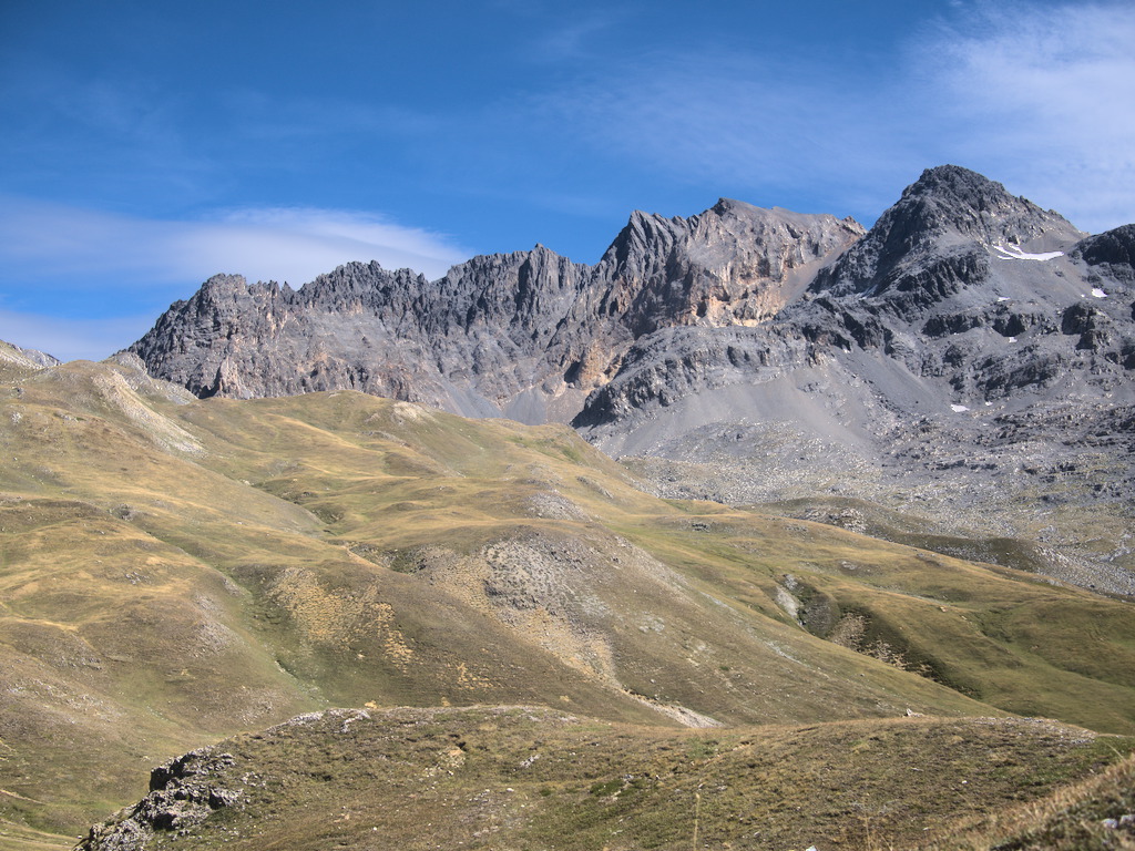 Superato il bivio per Punta Nera, la cui cima dal colore fedele al nome avevo visto salendo nel vallone, arrivo al colle, dove soffia una brezza fresca e tesa. Alle mie spalle l'ampia conca erbosa percorsa nell'ultimo tratto, con lo Chaberton e la piccola piramide aguzza del Pic de Rochebrune, nel lontano Queyras a fare da sfondo. Alla destra la catena dei Re Magi, che una tavola di orientamento mi consente finalmente di riconoscere. A colle una croce di legno con incisi i nomi dei territori che qui confinano e oltre delle belle montagne calcaree, mentre lontano le cime della Vanoise con dei ghiacciai, di cui rimane solo il circo sommitale. Leggo qualche cartello di argomenti storici e naturalistici e scendo abbastanza in fretta, prima che il vento mi faccia intirizzire. Poco sotto di me c'è un bel dosso protetto, dove potrei pranzare, se non fosse che è già occupato da una signora accompagnata da un cane.