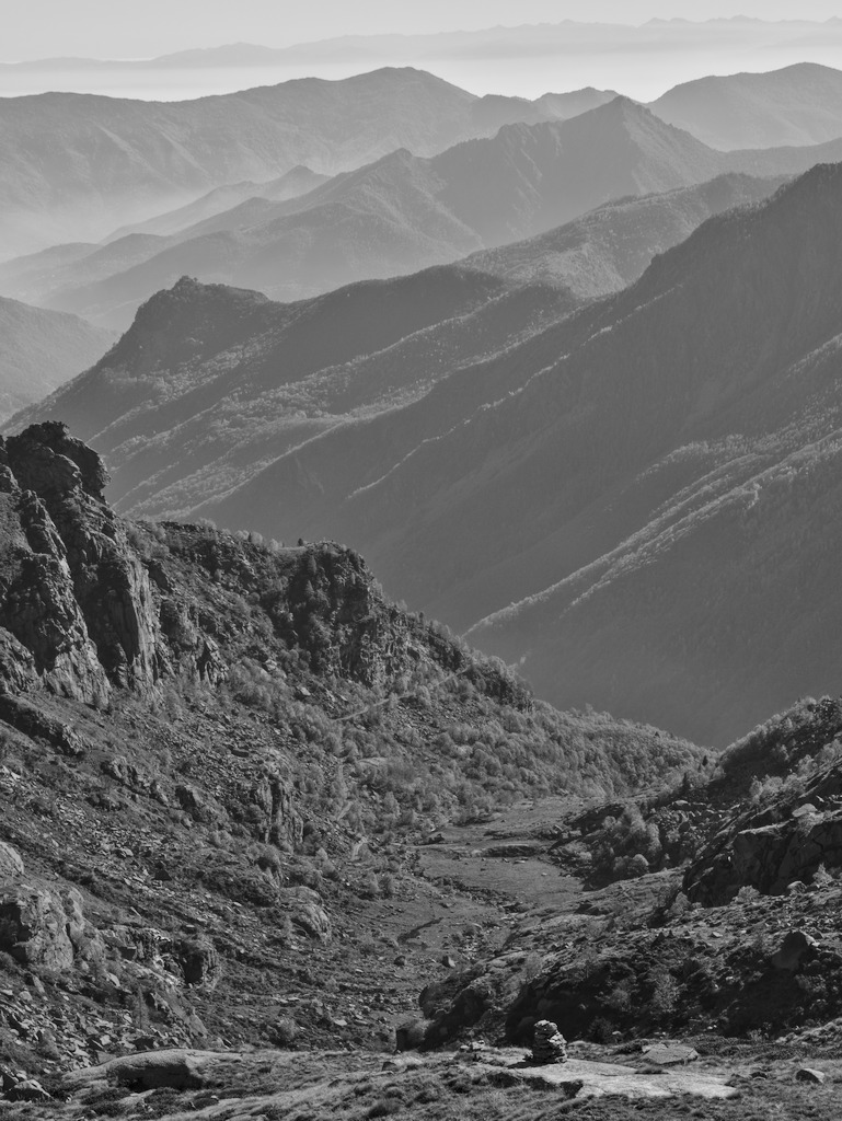 Per puntare verso Pian di Lee, seguiamo il sentiero che aggira la conca sul lato settentrionale, restando un poco a monte del fondo. Dobbiamo attraversare alcune zone paludose, che, come abbiamo notato, sui questi pascoli non sono rare e in passato avevano attirato l'attenzione di chi voleva rendere più moderna l'agricoltura montana, perché erano improduttive e potevano essere focolai di infezioni. Lo stesso si può dire dei molti sassi che abbiamo incontrato nei prati attraversati, di cui si auspicava un duro ma remunerativo lavoro di rimozione. Il sentiero inizialmente è poco evidente e dobbiamo affidarci ai bolli blu. Più avanti migliora decisamente: tratti gradinati e lastricati ne fanno un manufatto pregevole. Arriviamo al piccolo alpeggio di Li Arrè, affacciato verso valle, con una vista strepitosa sulla successione blu delle creste. Vediamo anche le vicine baite dell'alpe Biolla. Da qui il sentiero diventa decisamente più ripido e meno lavorato, giusto una striscia di terra nei prati. Arrancando con gran pena ci trasciniamo verso il colle, dove la fatica è ampiamente ripagata. Abbracciamo con un solo sguardo tutta la conca di Vailet e, sul versante opposto, vediamo le alpi che ci aspettano e il lago Pian di Lee, quasi secco. Soffia una lieve brezza, molto gradevole: nonostante sia fine ottobre, fa davvero caldo, quasi come a luglio. L'anno scorso in questa stagione ero salito sferzato da un vento gelido e avevo apprezzato la tisana del termos sopra ogni cosa.