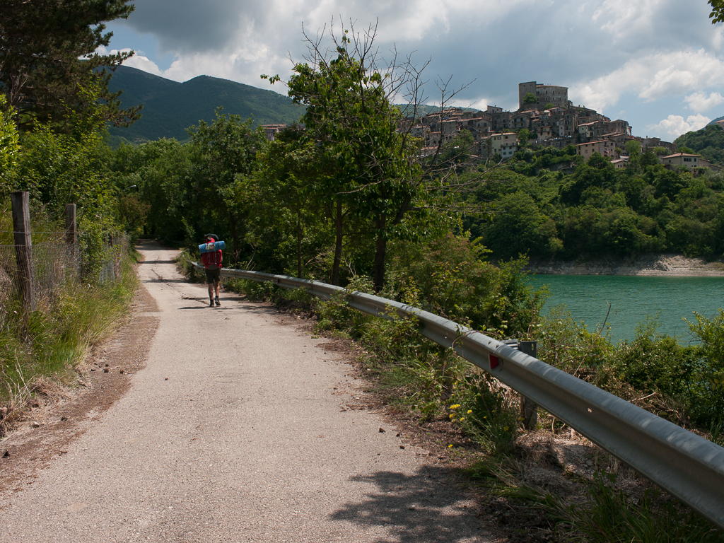 Proseguiamo e, prima della diga, ci troviamo in mezzo ad un'orda di motociclisti, che per fortuna non vanno nella nostra direzione. Ammiriamo da vicino il lago, che da Posticciola avevamo visto da lontano. Fu creato negli anni Trenta del Novecento. È collegato al lago del Salto, nella valle accanto, con una condotta forzata che produce energia, mentre le sue acque sono una riserva idrica, per vari scopi. Dalla riva vedremo dei Canadair che si addestrano. Ci incamminiamo su una strada asfaltata che più avanti è interrotta da una frana; il passaggio a piedi non presenta tuttavia difficoltà, perché la terra si è assestata e su di essa è stato ricavato un sentiero. Nonostante la vista sul lago, la strada è noiosa e il tempo lo trascorriamo chiacchierando dei passati viaggi a piedi.